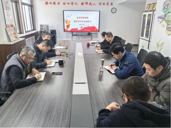 102026/033月10日,体育学院党委召开理论学习中心组(扩大)学习会,认真学习贯彻习近平总书记重要讲话精神及党中央关于树立和践行正确政绩观学习教育有关会议精神。会议由党委书记杨长青主持,院领导班子全体成员参加。会议集中学习了习近平总书记在二十届中央纪委五次全会上的重要讲话和习近平总书记关于树立和践行正确政绩观论述摘编部分内容。传达学习了中央党的建设工作领导小组在研究部署树立和践行正确政绩观学习教育工作会上的会...