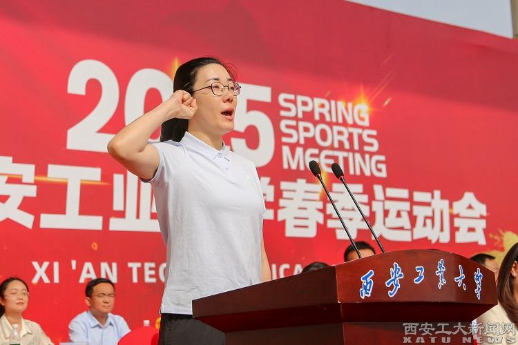 电子信息工程学院周明宇同学代表全体运动员宣誓。新生院教师周莎莎代表全体裁判员宣誓。
